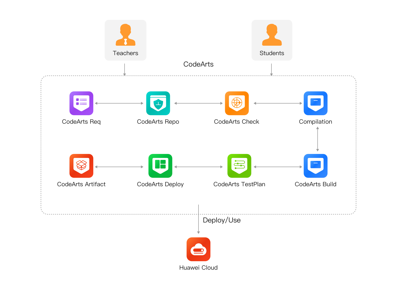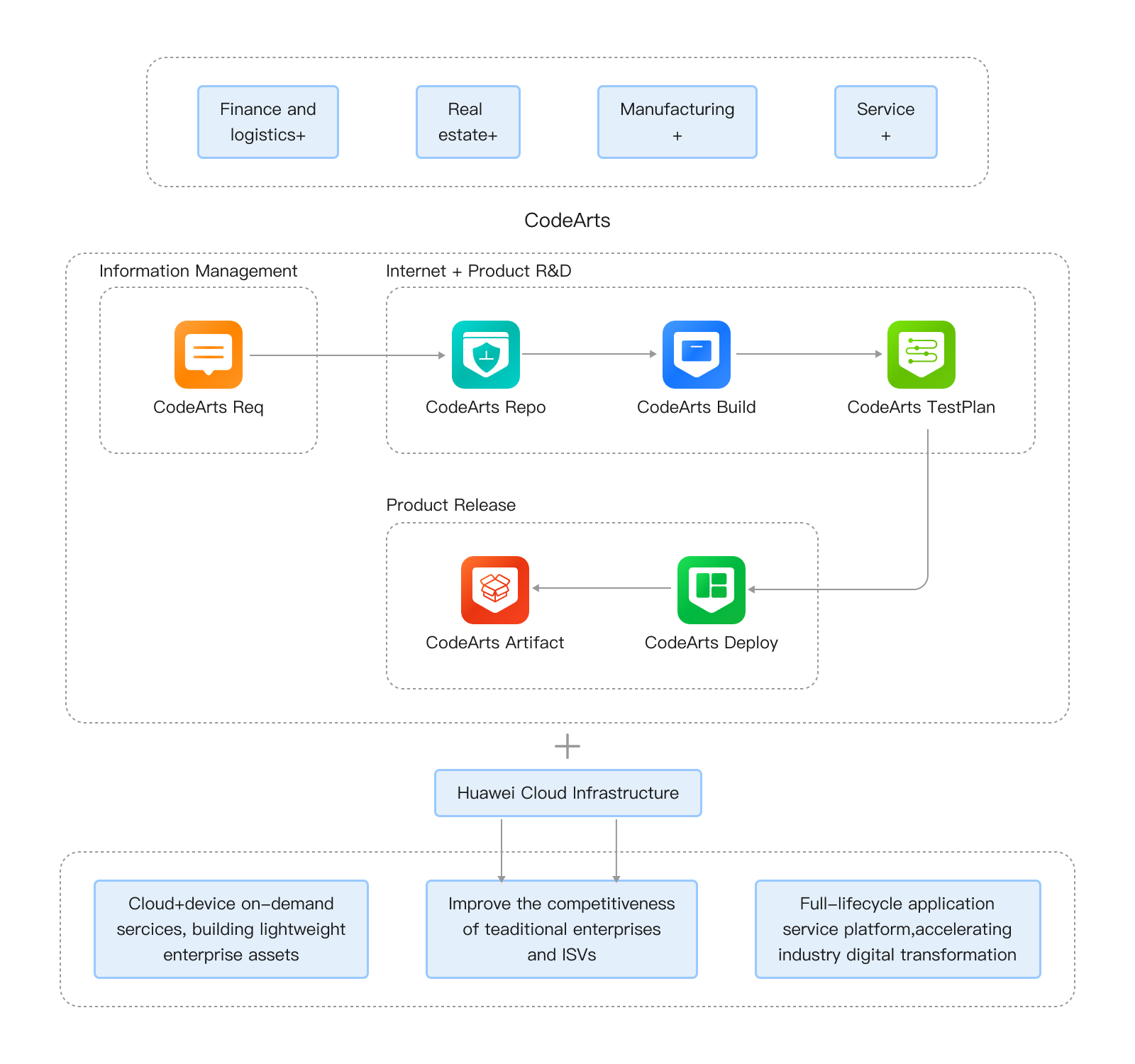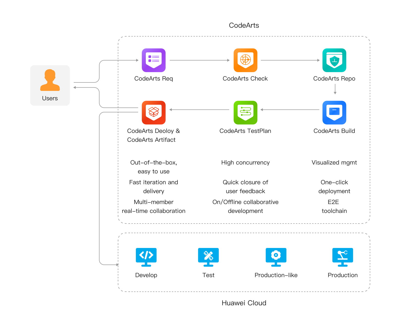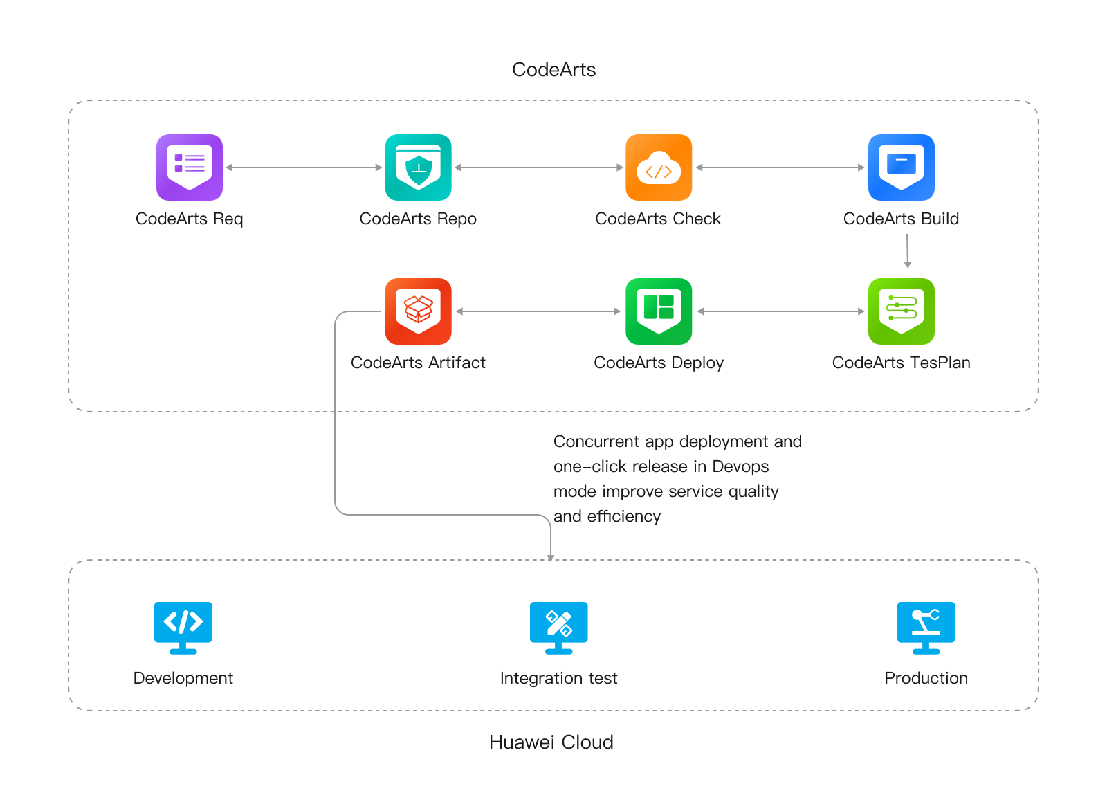 Full-lifecycle software development services, including CodeArts Req, CodeArts Repo, CodeArts Pipeline, CodeArts Check, CodeArts Build, CodeArts Deploy, CodeArts TestPlan, and CodeArts Artifact