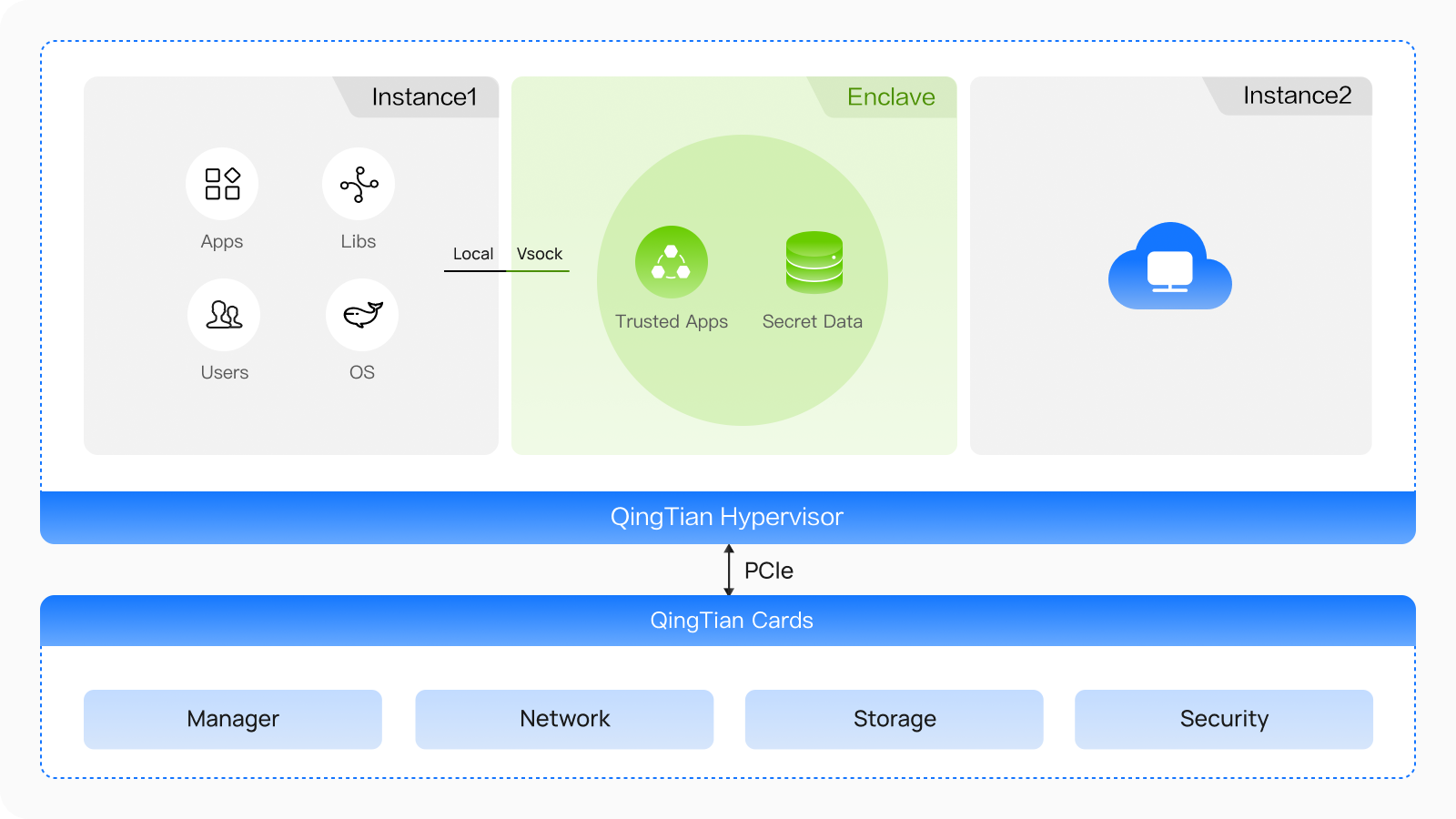 QingTian Enclave is a completely isolated, highly trusted computing execution environment. It has no persistent storage, interactive access, or external network connections. After an isolated enclave environment is created from the parent instance, instructions and applications are delivered to the isolated environment through an encrypted local channel. This greatly reduces the attack surface.
