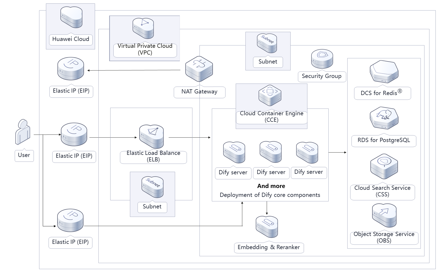 This solution is built on CCE for fast deployment of the highly available Dify platform, an LLM application development environment.