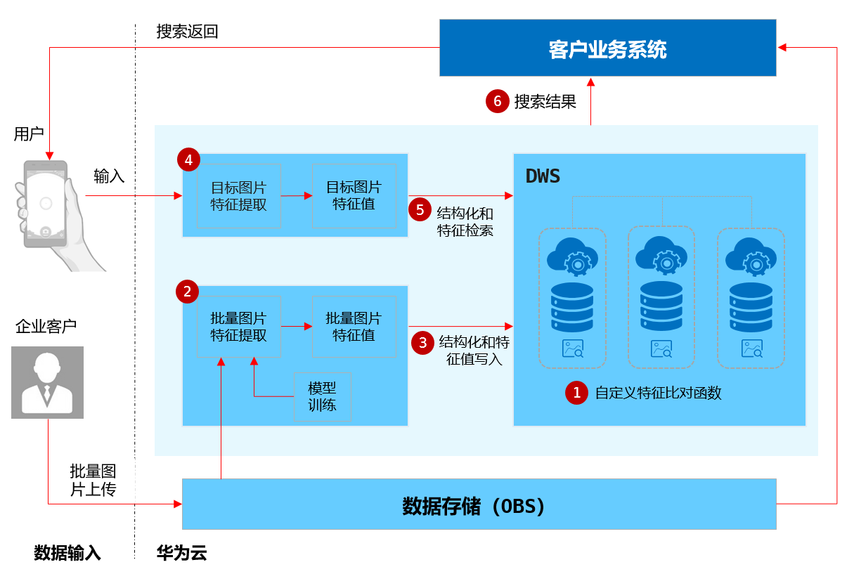 图5-2给出了在平安城市项目中,结合OBS存储和GaussDB(DWS)提供的多维数据碰撞分析特性,应用AI算法模型实现人脸识别和车辆检索的原理示意图。
