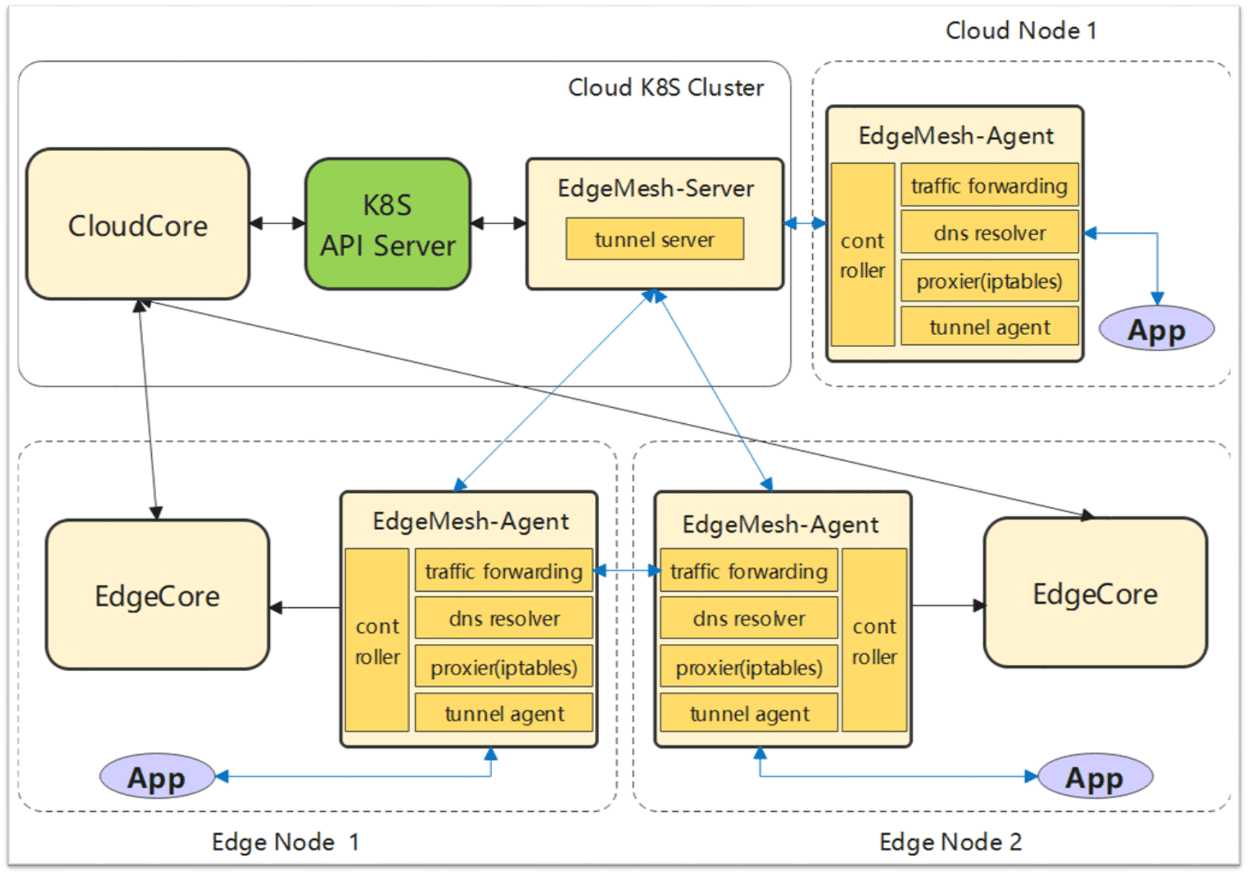边缘节点资源有限,很难完成复杂的业务流程,因此在实际业务场景中,边缘应用往往需要和云端应用互相配合,实现端到端的解决方案。