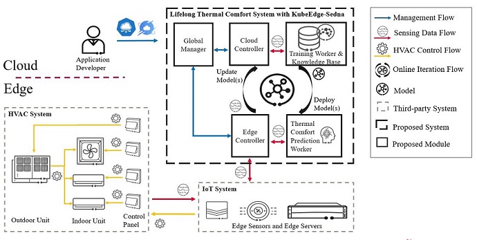 2022年6月28日, 边缘云创新Lab 边云协同终身学习论文发表于计算机能源顶级会议ACM e-Energy。获发表论文题目为Towards lifelong thermal comfort prediction with KubeEdge-Sedna: online multi-task learning with metaknowledge base,主要讲解KubeEdge-Sedna边云协同终身学习在楼宇冷机控制领域的创新应用。现代社会中人们有高达80%在楼宇里工作生活。楼宇系统长期在边侧管理日常能源计算和运作。在楼宇冷机控制领域,学术界已经开发了许多数据驱动的模型和系统,但现有技术在实际业务中使用还存在问题:这些技术要么需要足够数量的样本,要么需要数据科学家进行详细数据分析。这些问题出现的原因是大部分方法中没有提供记忆能力,从而阻碍了服务的可扩展通用部署和终身维护。我们首次研究了通过训练边云协同终身学习模型来实现楼宇冷机服务的在线多任务维护。提案引入元知识及其运算符,以自动发现生成了哪些模型、何时使用它们以及如何更新它们。我们使用公共ATCII数据集评估我们的框架,实验表明提案对比所有最先进的基线,平均性能相对提升30.02%。报告相关论文已被计算机能源领域国际会议ACM未来能源大会(ACM e-Energy)接收,该会议是计算机与能源交叉的ACM SIG Energy两个顶级会议之一。部分框架代码已被采用并开源发布到KubeEdge-Sedna。