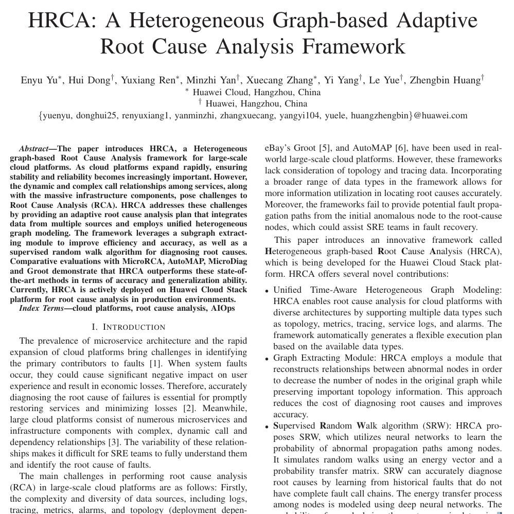 《HRCA: A Heterogeneous Graph-based Adaptive Root Cause Analysis Framework》被ISSRE 2023录用
