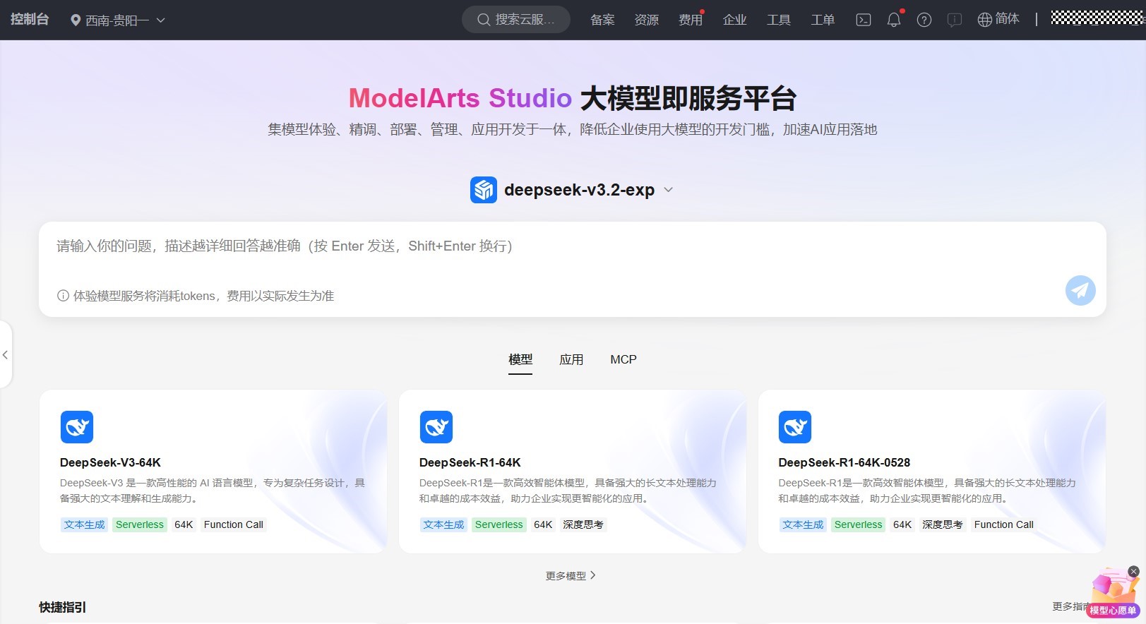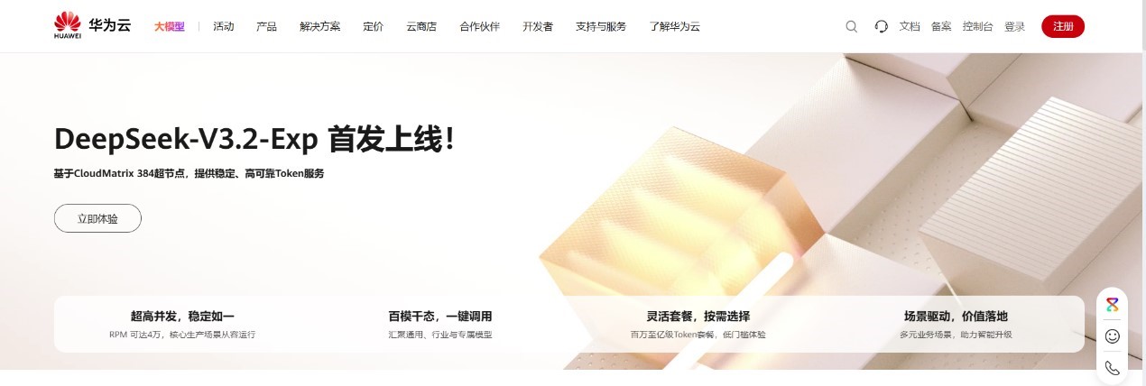 访问华为云官网导航菜单“大模型”——点击“DeepSeek-V3.2-Exp首发上线-立即体验”,进入大模型服务平台模型体验页面,选择“DeepSeek-V3.2-Exp”模型体验。