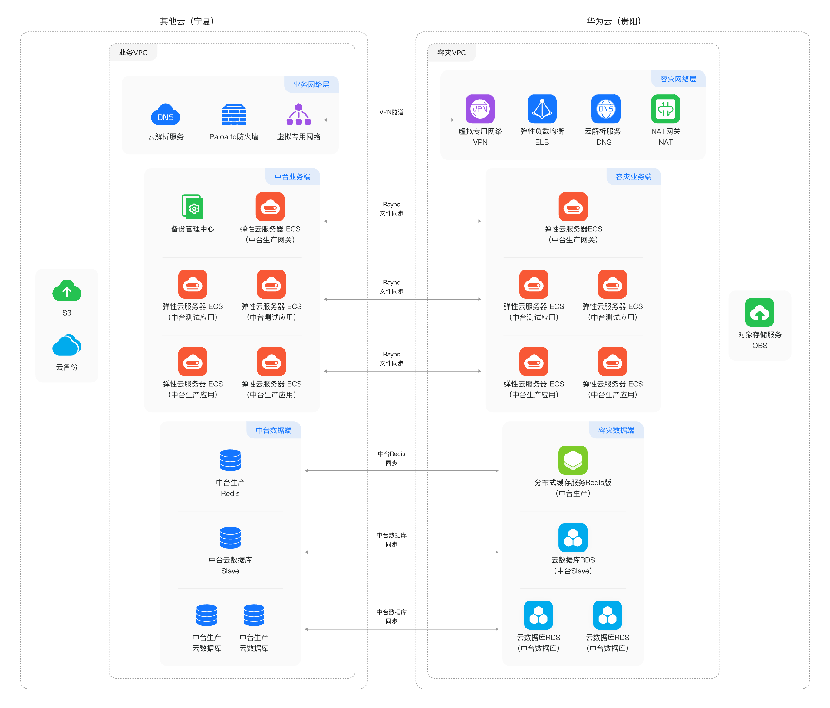异构云协同:通过VPN专线连接华为云与A1站点,借助数据库同步工具实现Redis、ES、MySQL及目录文件的跨云同步,规避单点故障风险。
