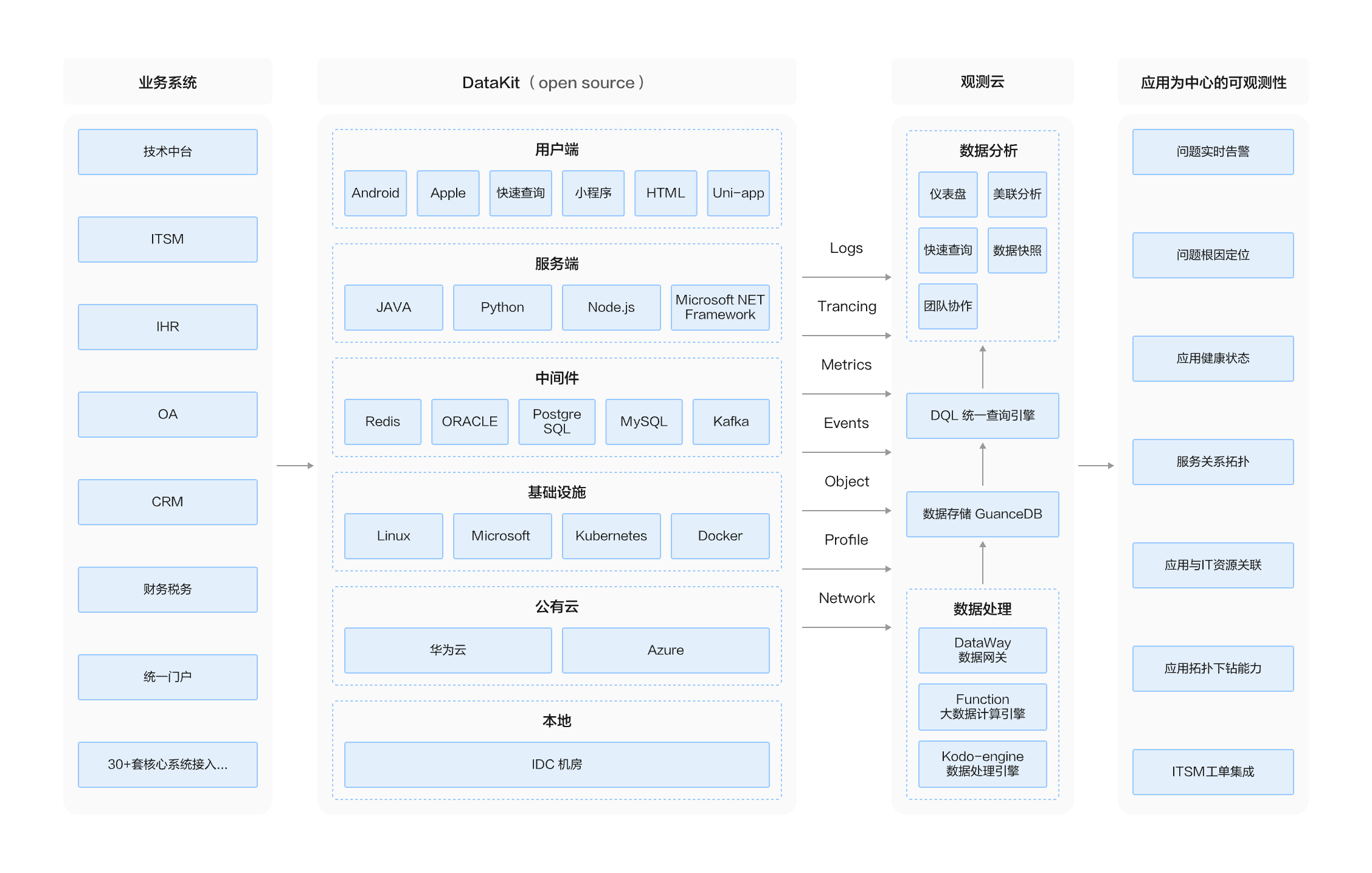 统一采集:通过观测云 OneAgent,覆盖应用、数据库、中间件、容器、网络、操作系统等多维度监控数据,无论是云上、IDC还是私有云环境,都能快速完成接入。
