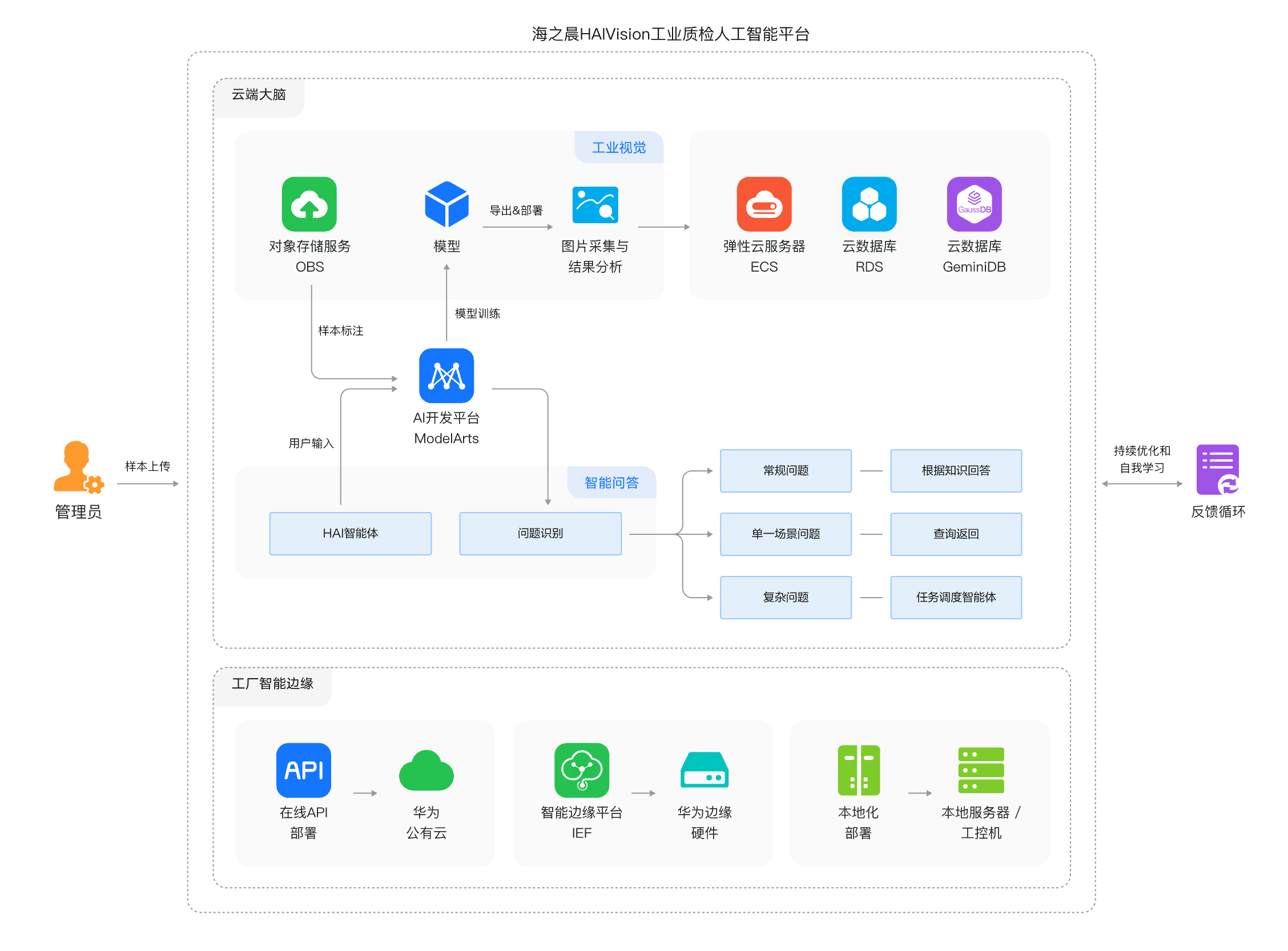 算法优势:采用华为自研的MindSpore人工智能框架,提供先进的算法支撑,兼顾精度与通用性。针对典型场景(如缺陷检测、行为识别等),只需少量现场数据即可快速微调,算法上线周期从“月”缩短到“天”,效果却优于传统方案数个量级。