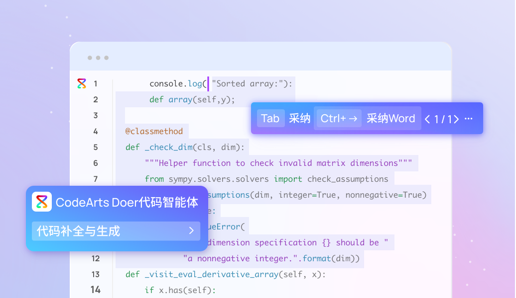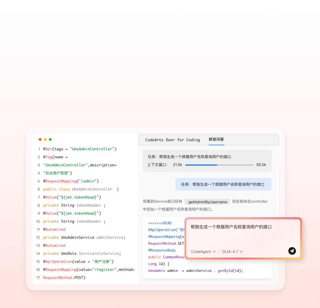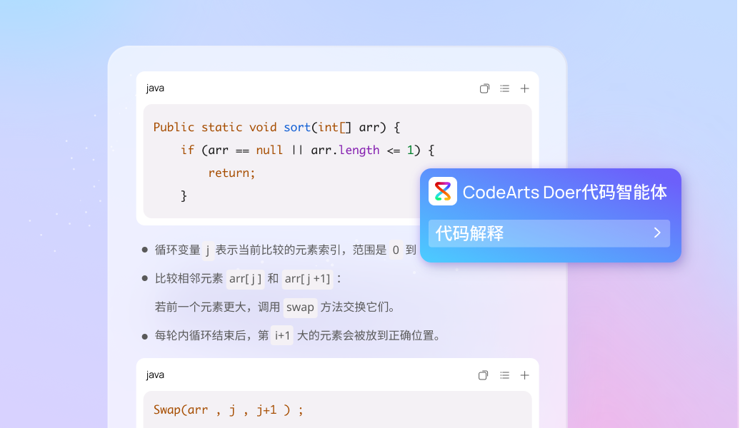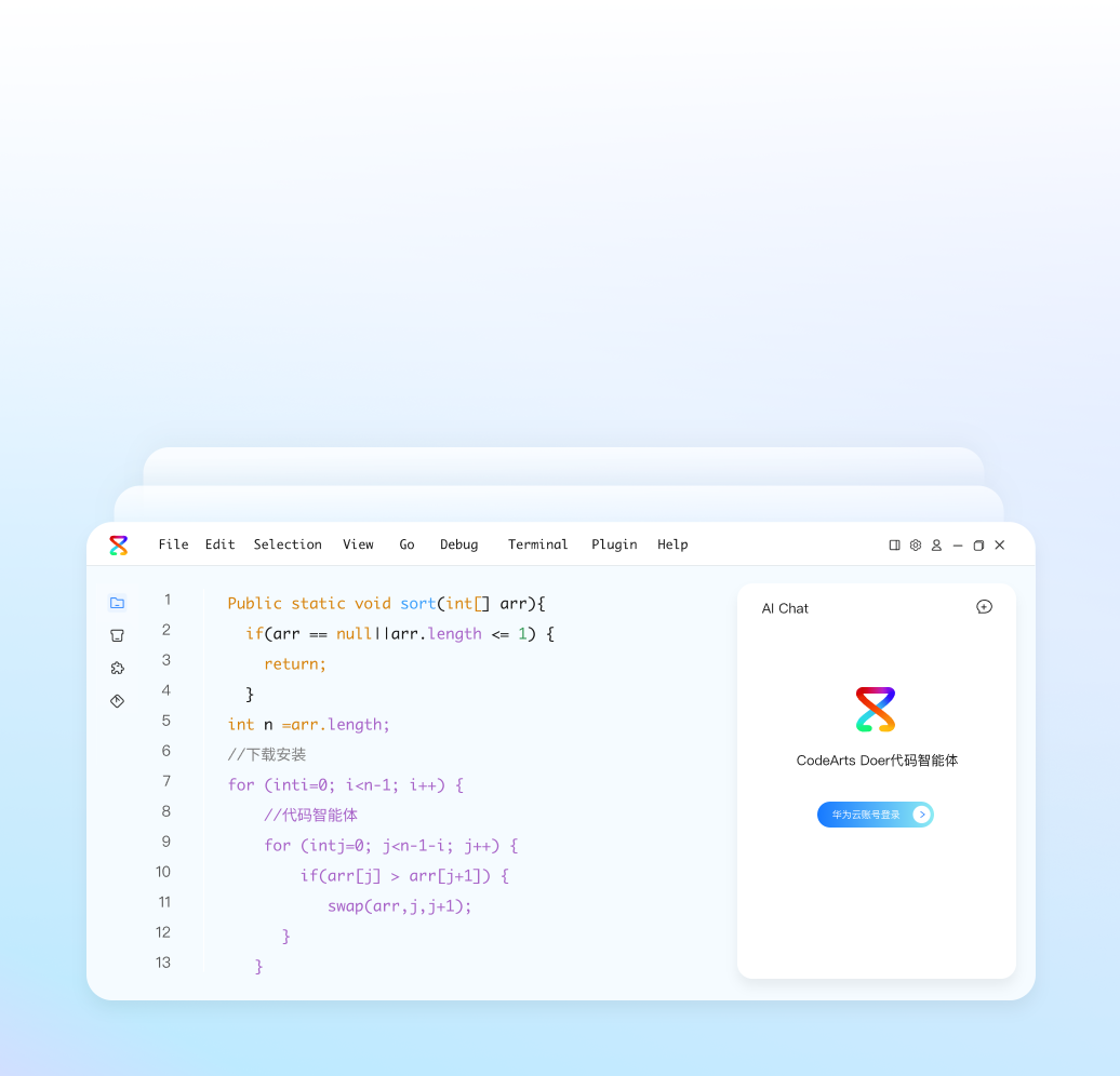 CodeArts Doer代码智能体是一款集代码大模型、AI IDE、代码Agent为一体的智能编码产品。面向代码生成、研发知识问答、单元测试用例生成、代码解释、代码注释、代码调试、代码翻译、代码检查、代码优化等场景功能,为开发者提高研发效率,提供极致的智能化编码体验。