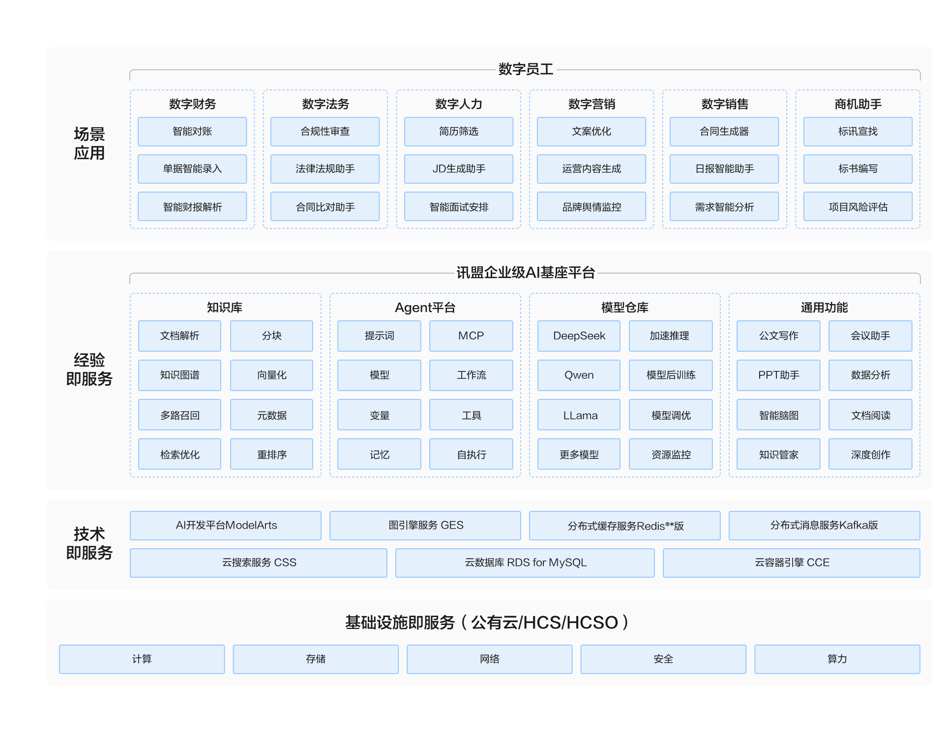 - 以AI驱动构建全流程数字员工体系,覆盖营销、法务、商机等场景,实现业务智能化