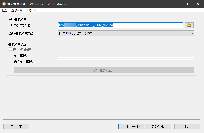 选择镜像文件名时,建议修改生成的镜像名称,以免覆盖原始ISO文件。