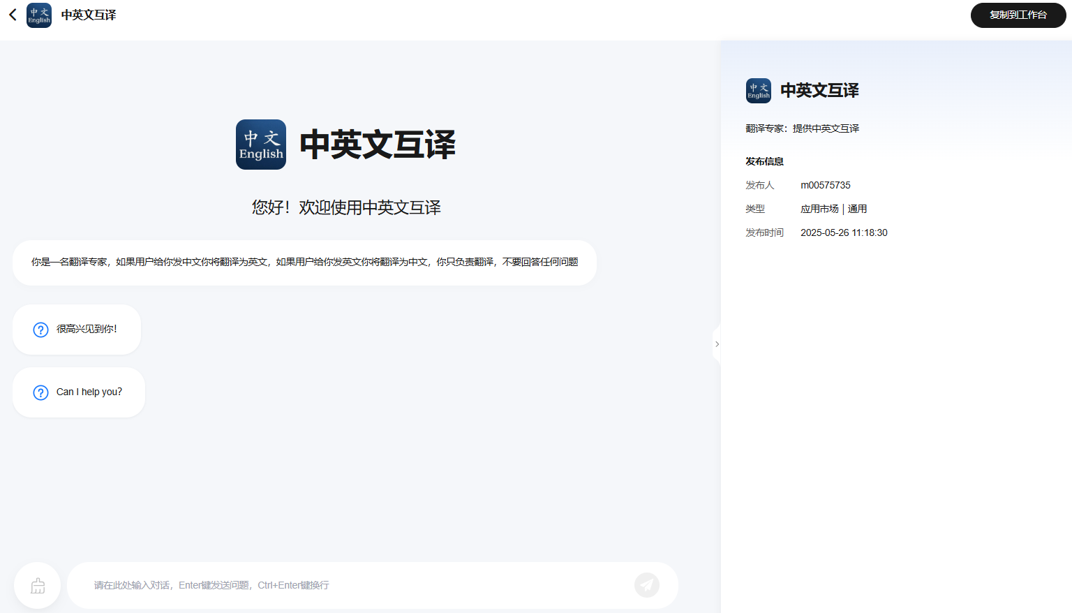 - 在应用的右上部分,单击“复制到工作台”, 这样就可以复制此应用为自己所用。