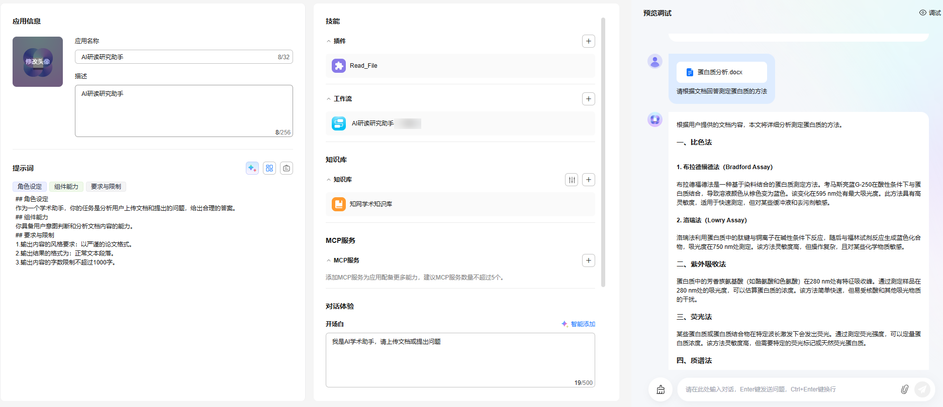 此系统采用应用Agent平台进行构建,通过图形化界面快速设计、配置各项功能模块,无需代码开发,降低开发门槛,为学术研究领域的读者或者作者提供基于上传文档或者本地文献库进行深度研读或者研究场景等。