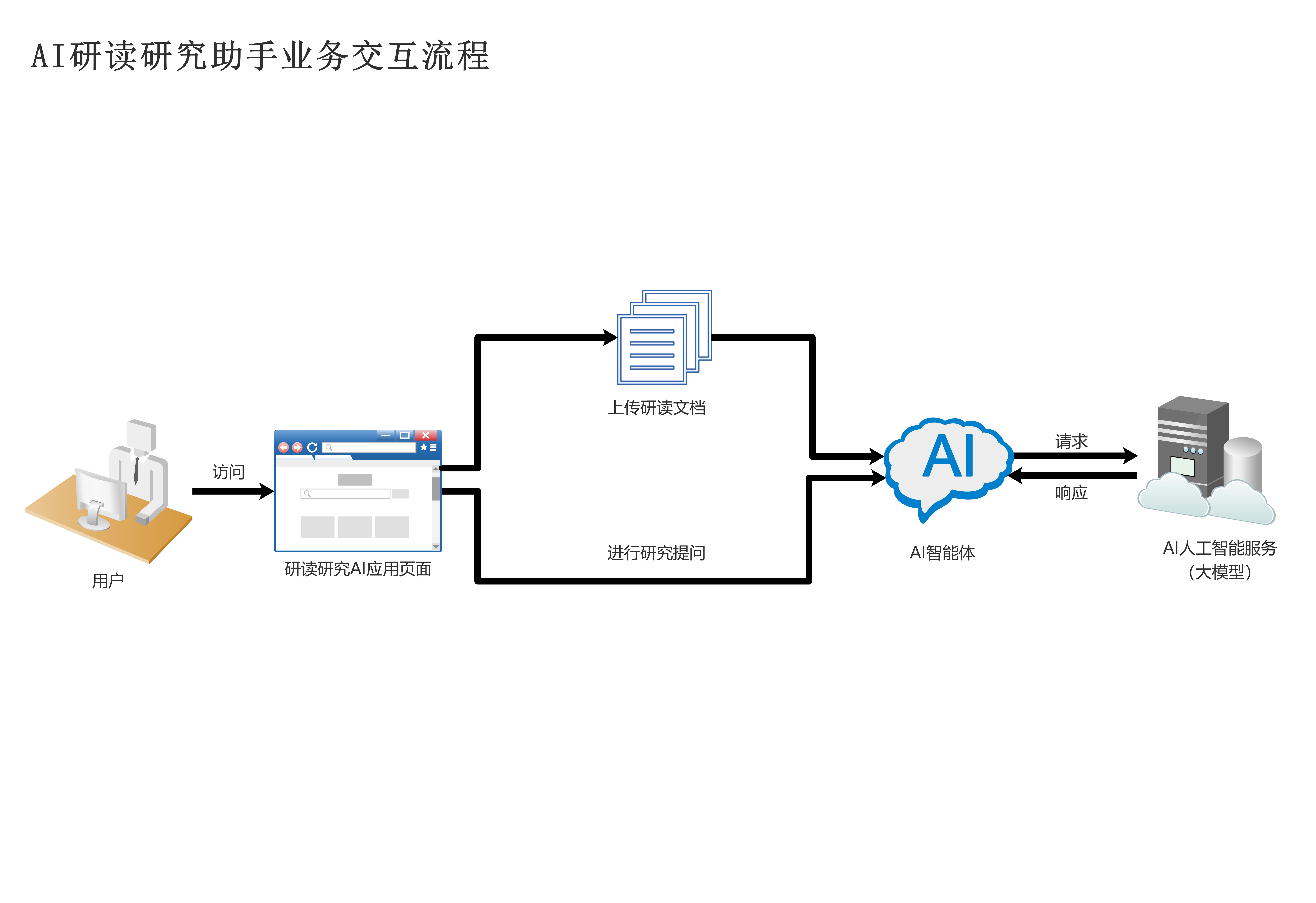 用户通过AI研读研究助手前端页面上传文档后,并基于文档内容向大模型提问,触发在Agent应用中预先设定的工作流,并实现用于与大模型之间的交互过程。